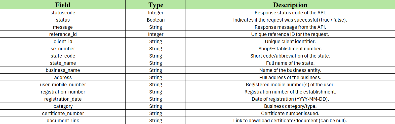 Detailspost https://uat.paysprint.in/sprintverify-uat/api/v1/verification/shop_establishmentResponse Fields Description: