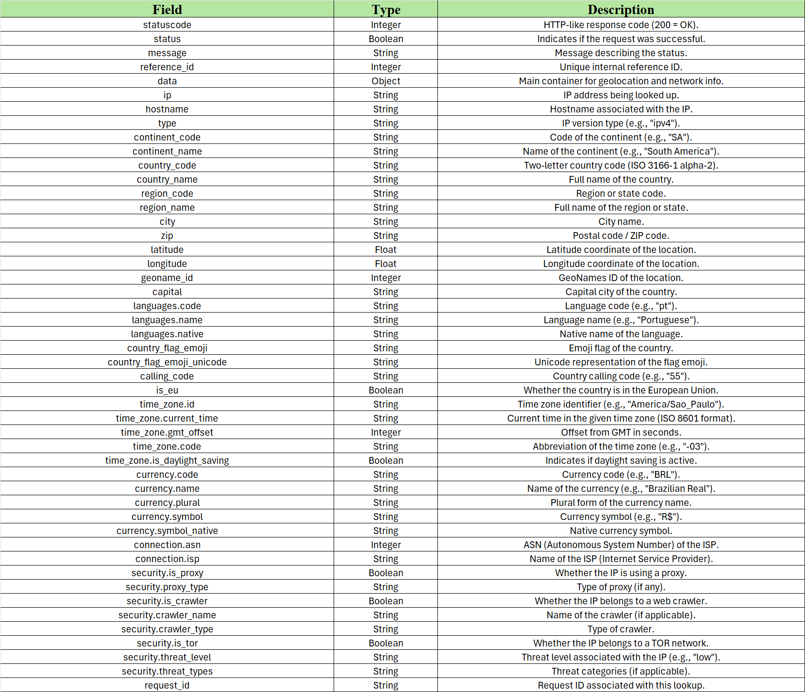 IP Lookup APIpost https://uat.paysprint.in/sprintverify-uat/api/v1/verification/ip_geo_lookupResponse Field Description