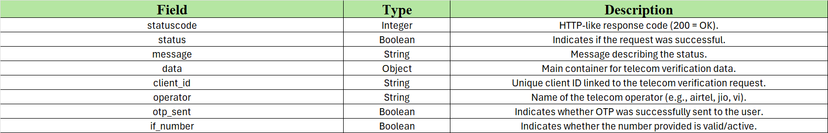Send OTPpost https://uat.paysprint.in/sprintverify-uat/api/v1/verification/telecom/sendotpResponse Field Description