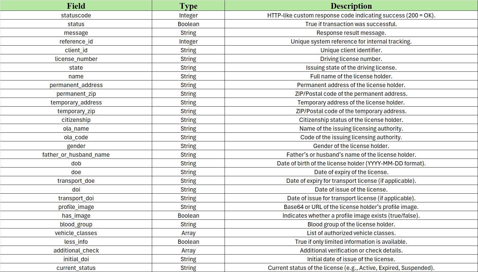 Driving Licence V1post https://uat.paysprint.in/sprintverify-uat/api/v1/verification/drivinglicense_verifyResponse Fields Description